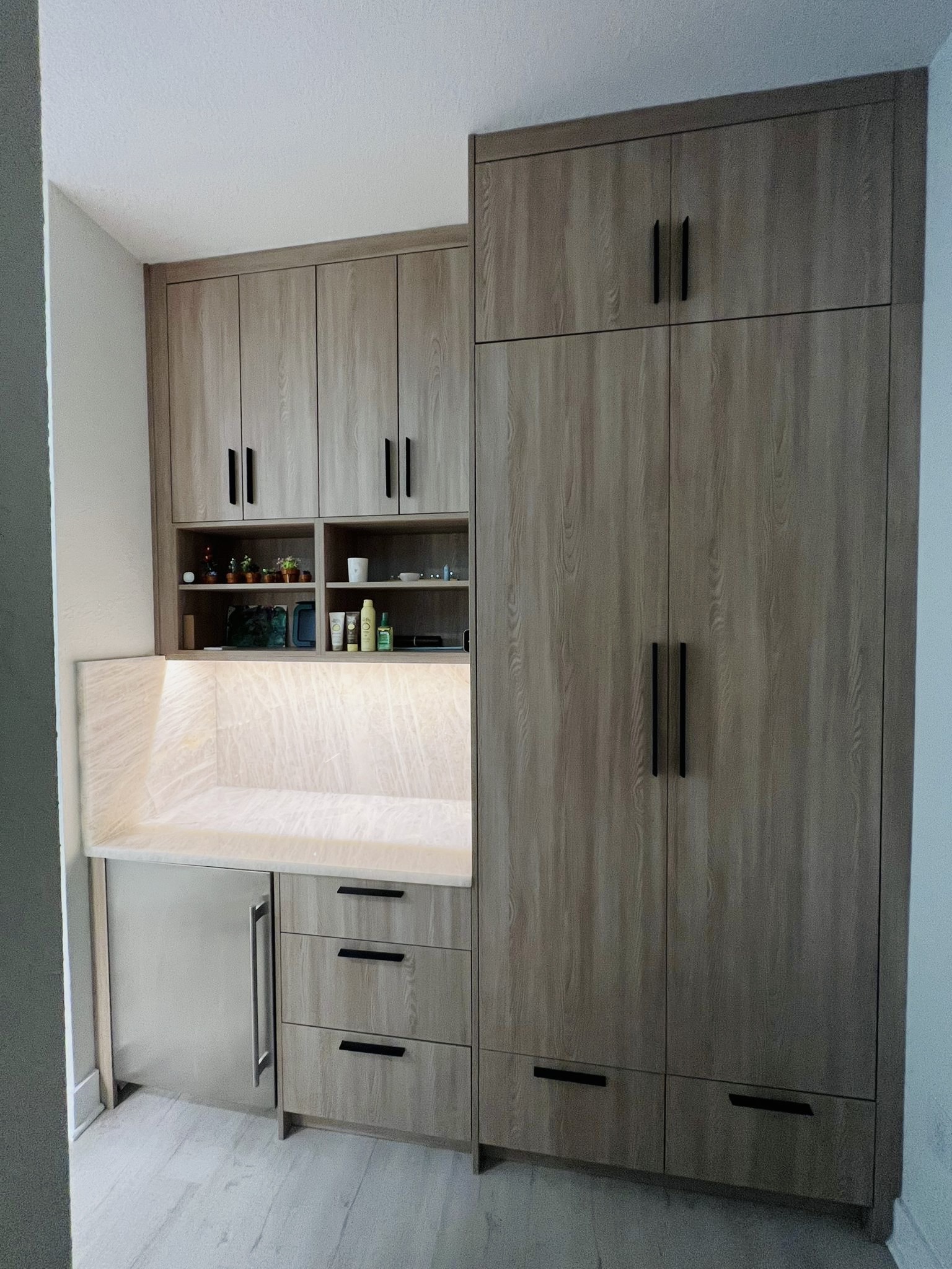 Maximized storage with elegant floor-to-ceiling white cabinetry in this Lake Mary home. Glass display sections showcase dishware while maintaining clean, modern aesthetics that perfectly complement the home's contemporary style.