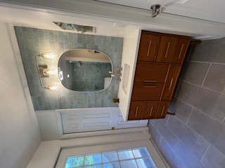 Contemporary bathroom design featuring a sleek floating wood vanity with modern fixtures in this beautiful Winter Park home. Beautiful tile accent wall and elegant oval mirror create a sophisticated, spa-like atmosphere with clean lines and premium finishes that match the area's charming residential character.