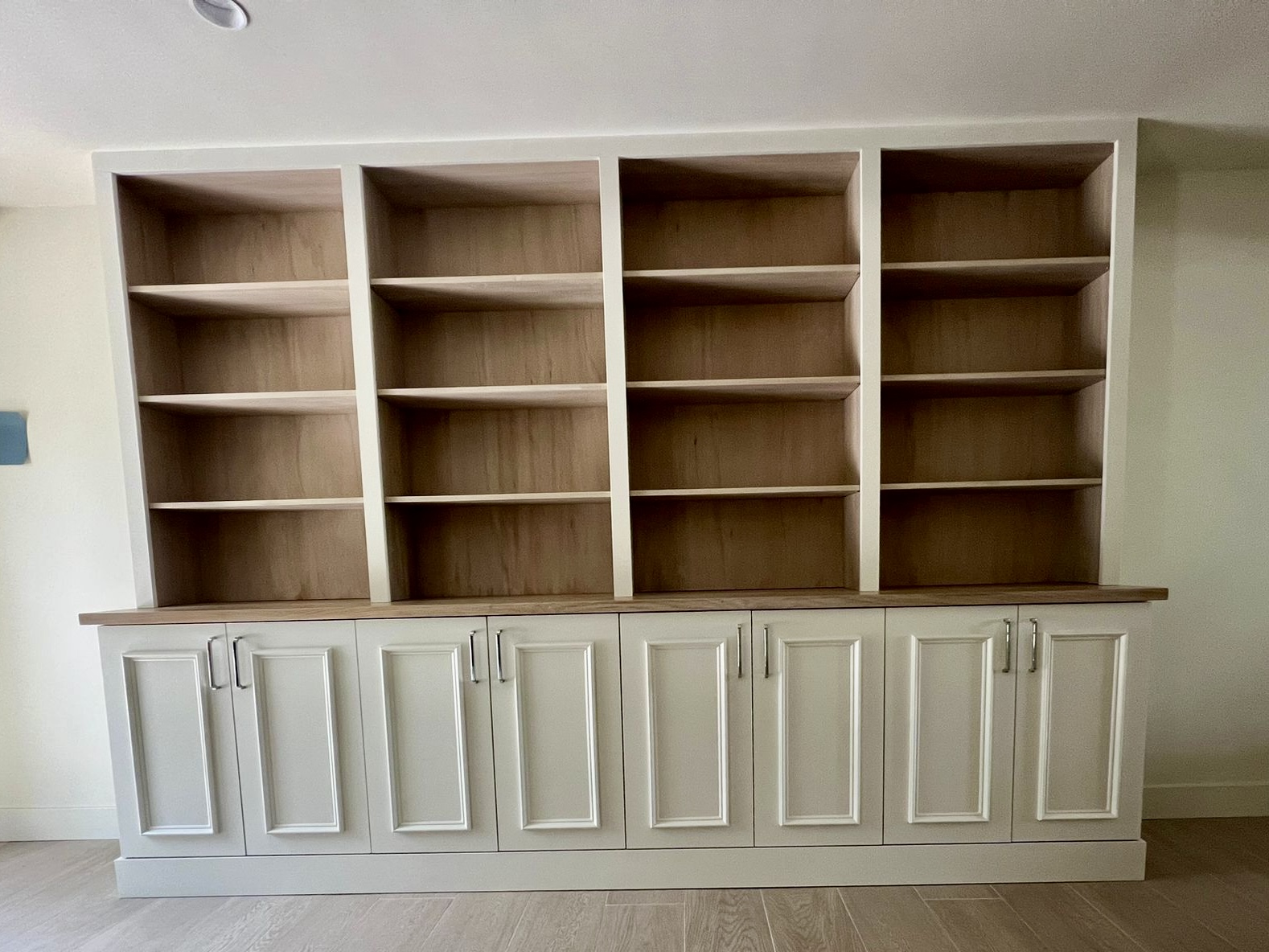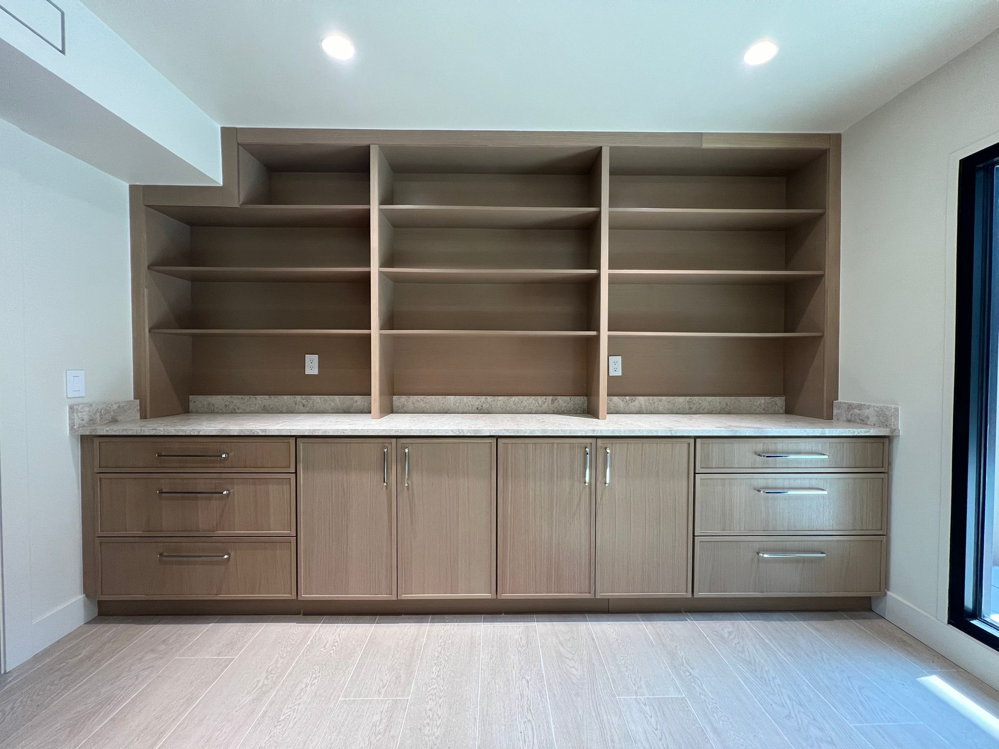 Elegant custom white oak bookshelf system designed for a downtown Orlando client. This built-in features open display shelving on top for books and decor, with spacious storage cabinets below. The clean lines and quality craftsmanship create both functional storage and an attractive focal point in this urban residence.