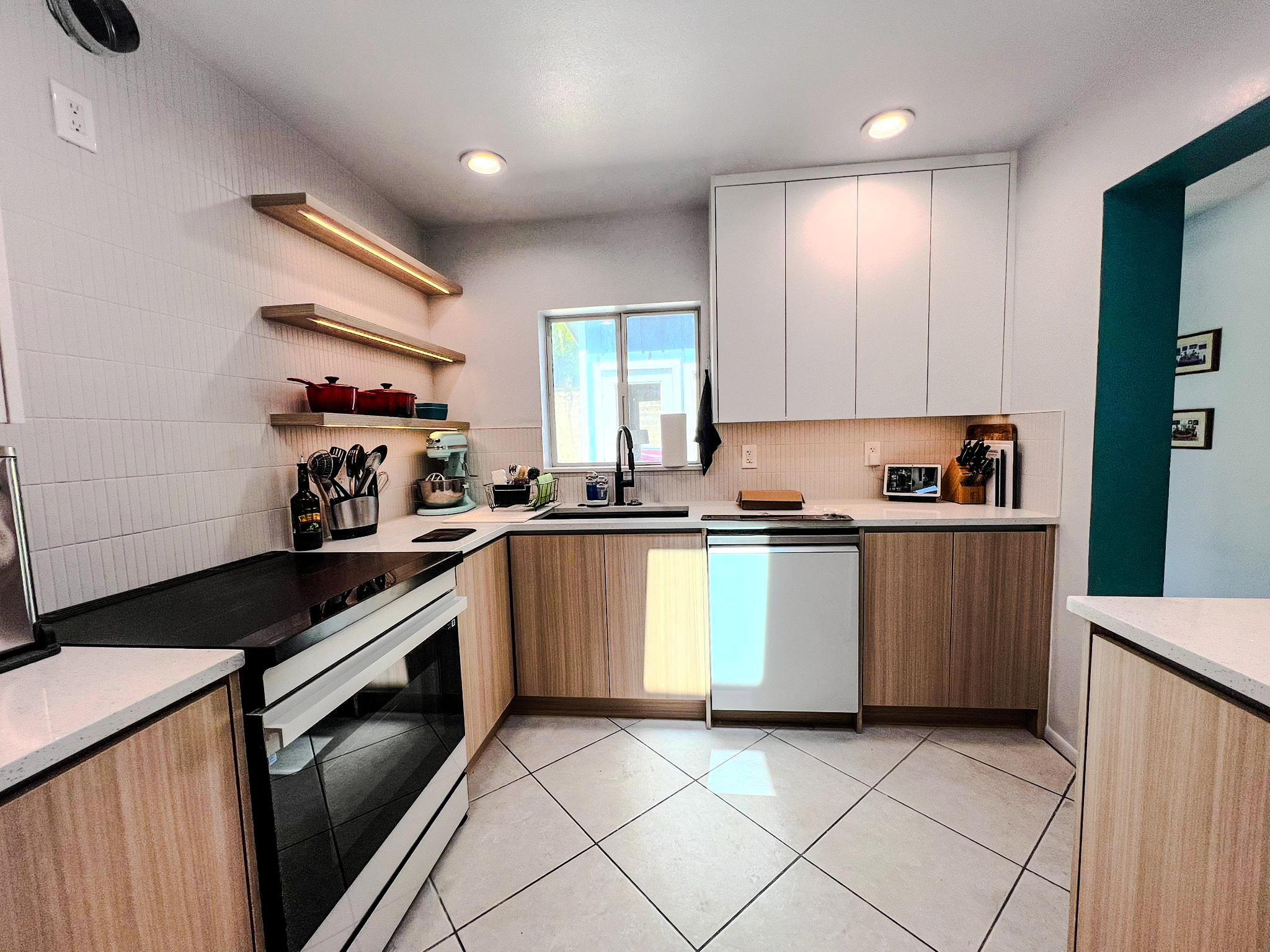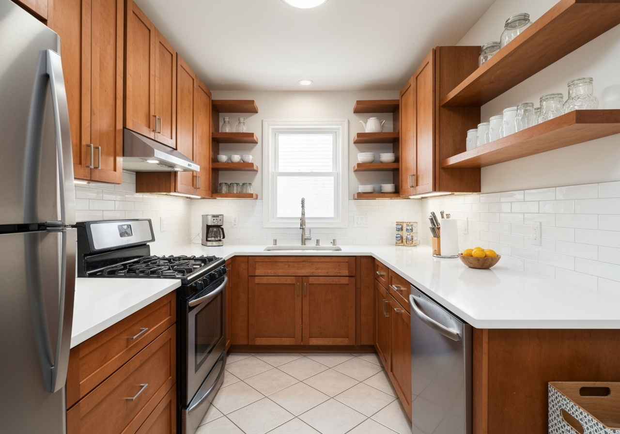 Smart galley kitchen design maximizes every square inch in this charming Baldwin Park townhome. Rich wood cabinetry and clever storage solutions prove that small spaces can be both beautiful and functional in this walkable community.