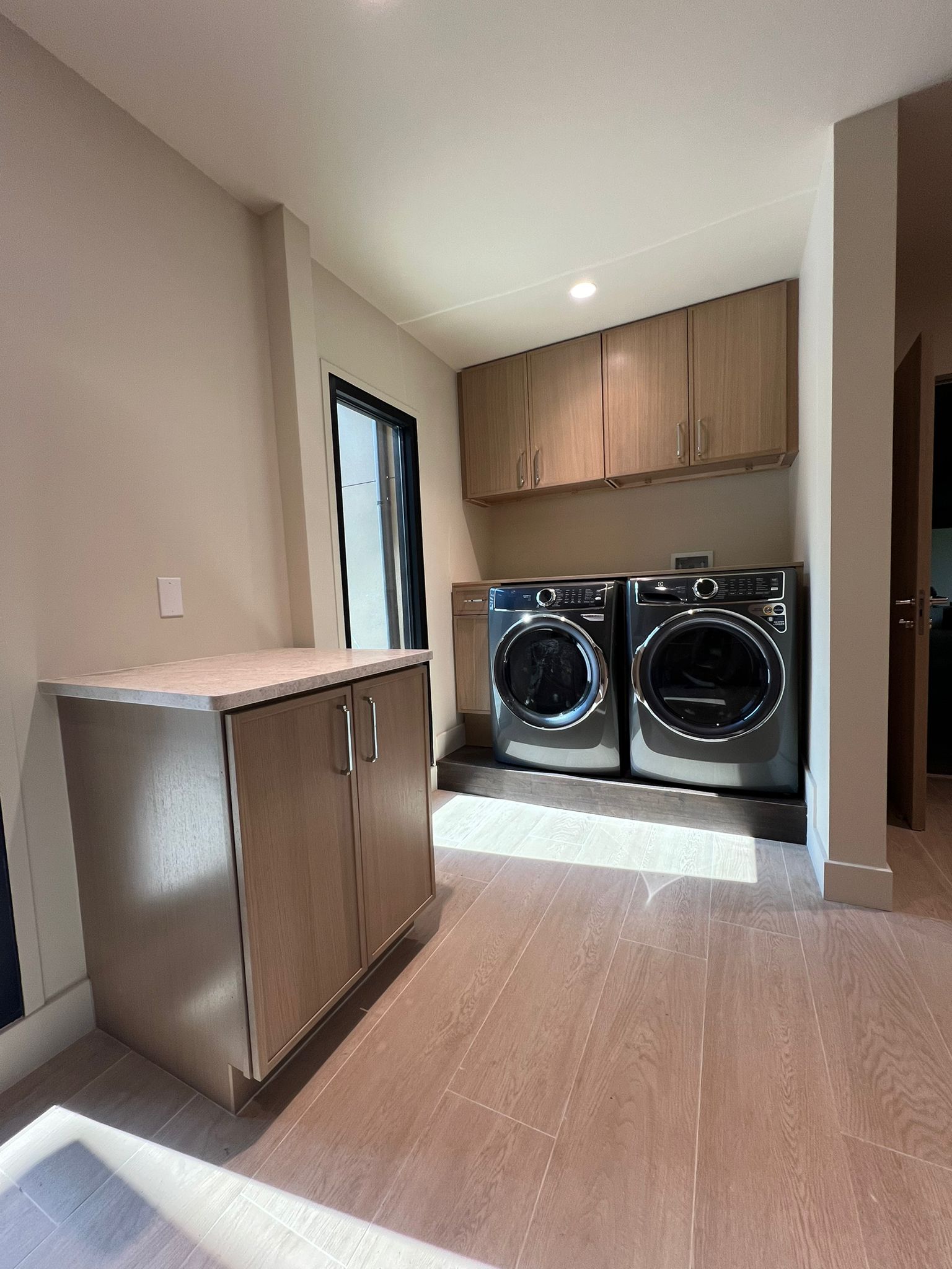 Stunning contemporary design blending warm wood tones with crisp white cabinetry in this Orlando residence. The centerpiece marble island provides both beauty and functionality for this growing family's daily needs.